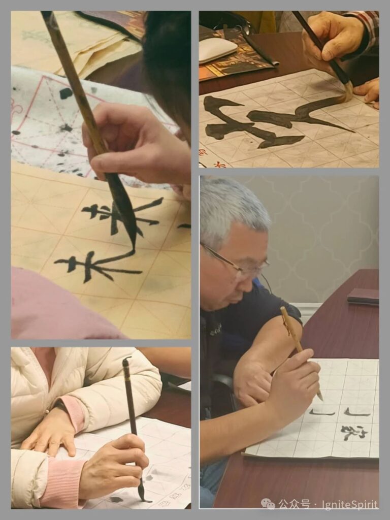 The first session of the calligraphy salon organized by the public welfare organization IgniteSpirit was held as scheduled on this Sunday afternoon. Opening the door, a cup of hot tea, a scent of ink, accompanied by the smiles and familiar greetings of acquaintances, Teacher Long opened the first session of the “Calligraphy Salon”. Everyone was very happy to see old friends. From the elderly to teenagers, as long as they are interested in Chinese culture and especially calligraphy, they can come to this “making friends with words” public welfare activity. What is more worth mentioning is that the lecturer, Teacher Long, not only has profound attainments in calligraphy, but his approachable and eloquent style makes everyone present feel relaxed. Teacher Long’s teaching of calligraphy techniques is even more remarkable. He started with theory, supplemented by personal demonstration, and explained in detail the details of pen, ink, and brushwork. Everyone practiced simultaneously and gave corrections from time to time.